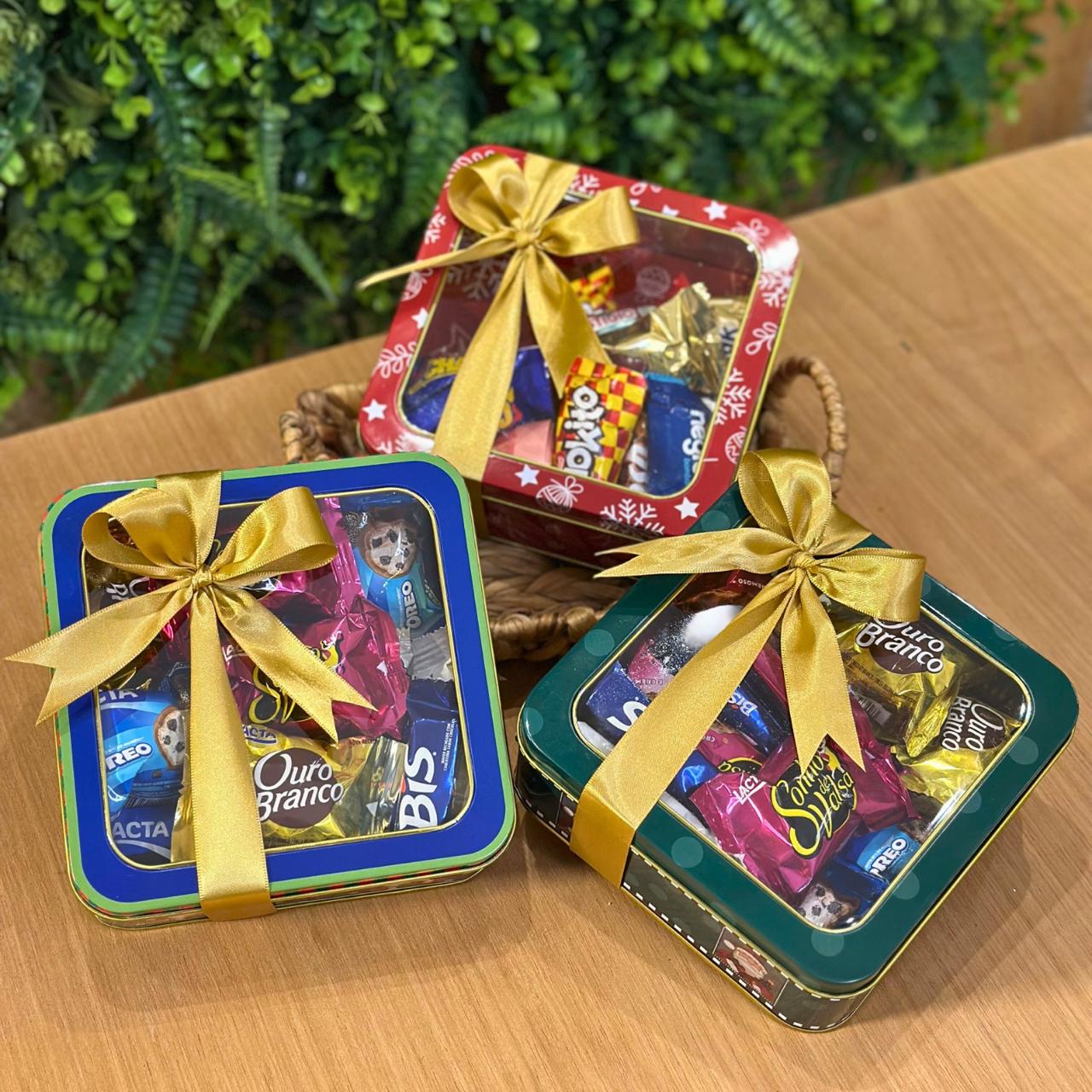 Monte seu presente do seu jeito! Esta oferta refere-se a 1 lata metálica quadrada (15×15×5,5 cm), com visor em acrílico e estampa natalina enviada de forma sortida (temas clássicos de Papai Noel e Renas). Perfeita para compor lembrancinhas, cestas, kits personalizados ou para organização após as festas.